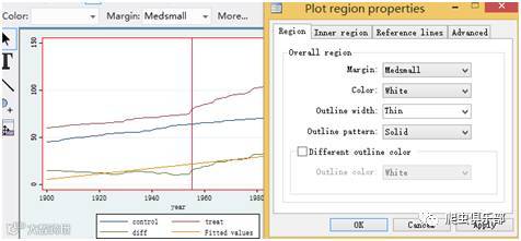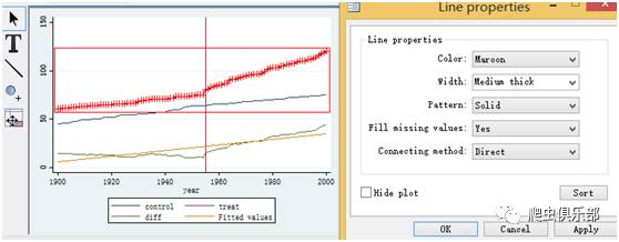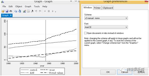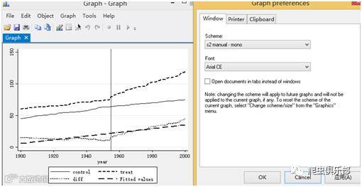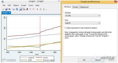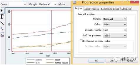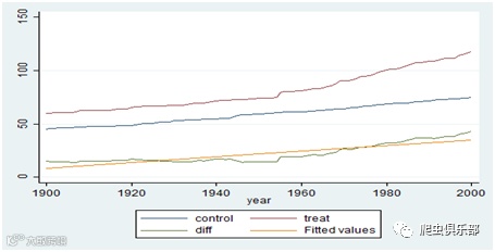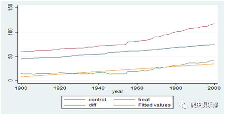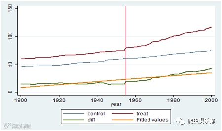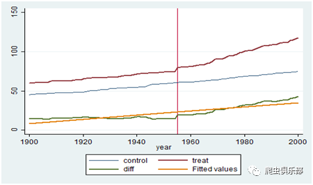 line control year,lwidth( medthick)yaxis(1) xline(1955) xaxis(1) lwidth(medium) || line treat year ,lwidth(medthick)||line diff year,lwidth( medthick)||lfit diff year,lwidth( medthick)