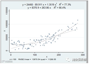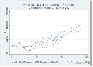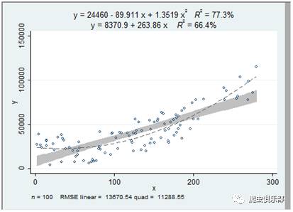 强大的aaplot命令可以画线性和二次拟合以及两者的叠加。并给出了方程表达式、R^2(显示在图的顶部)、观测值的个数和RMSE(显示在图的底部)。