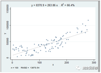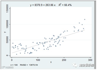 由图可以得出线性拟合的的回归方程以及R^2,以及图下方的观测值和RMSE均方根误差