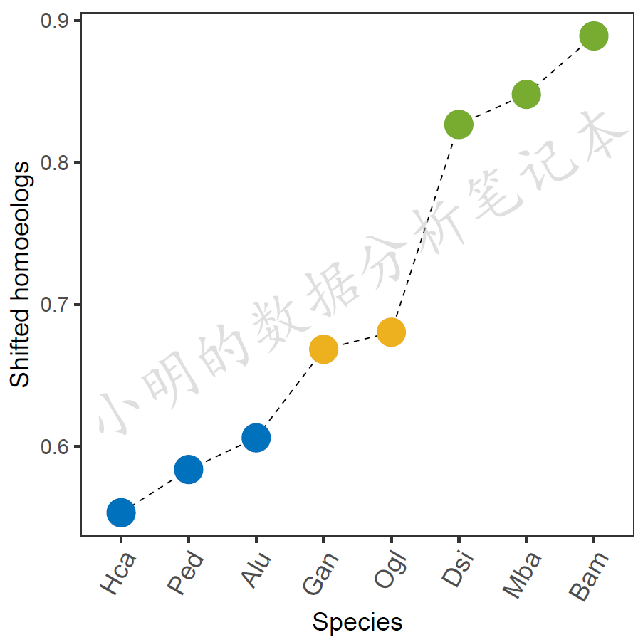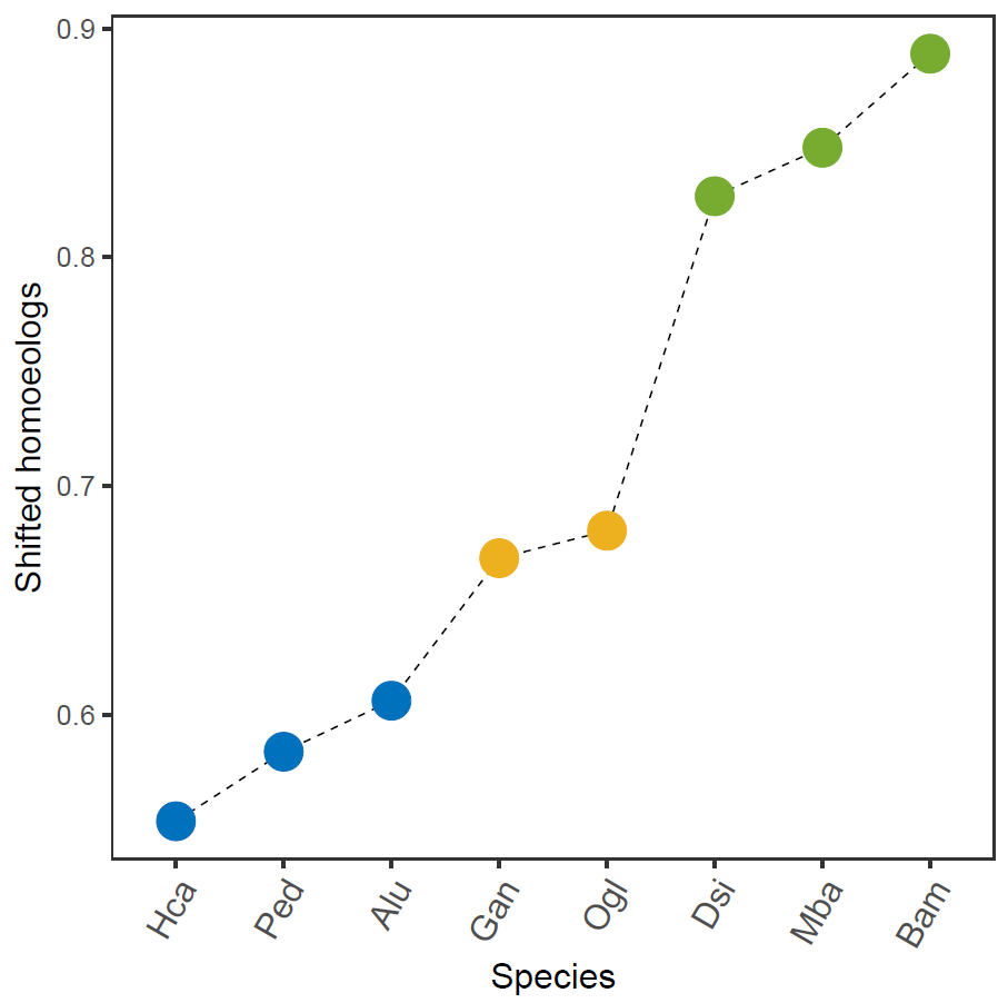 ggplot(aes(x=Species,y=`Shifted homoeologs`))+