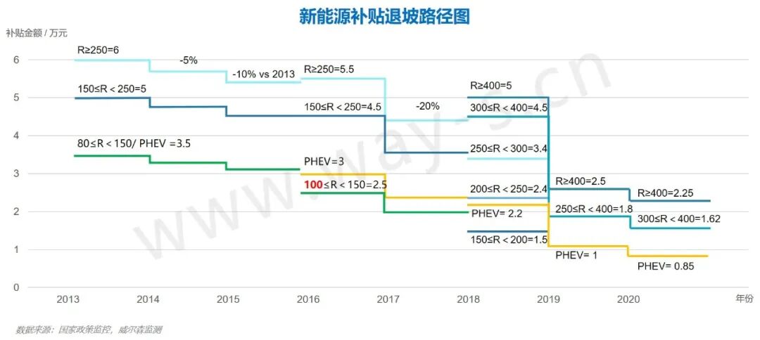 纯电动车型续航里程门槛从250km提高至300km,补贴金额降低10%。