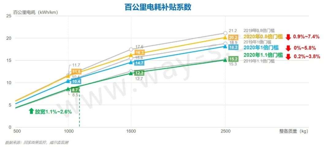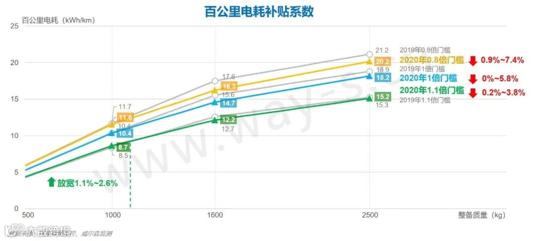 2020年百公里电耗补贴标准系数门槛在2019年的基础上进行了小幅加严。其中1000kg以下的小型车因为达成当前百公里电耗门槛难度已经很高,本次有所放松;对于整备质量较大的车型加严幅度较大。