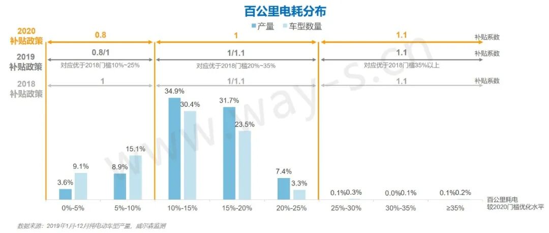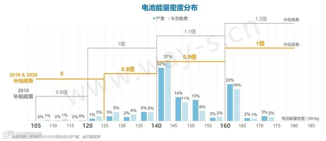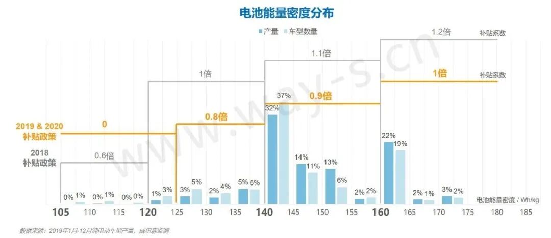 从2019年的分布来看,大部分车型电池能量密度集中在140Wh/kg-160Wh/kg之间,可以获取0.9倍的补贴。