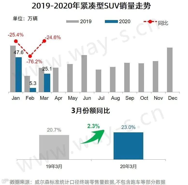 3月紧凑型SUV销量为25.1万辆,同比下降24.6%;份额为23.0%,同比上升2.3%。