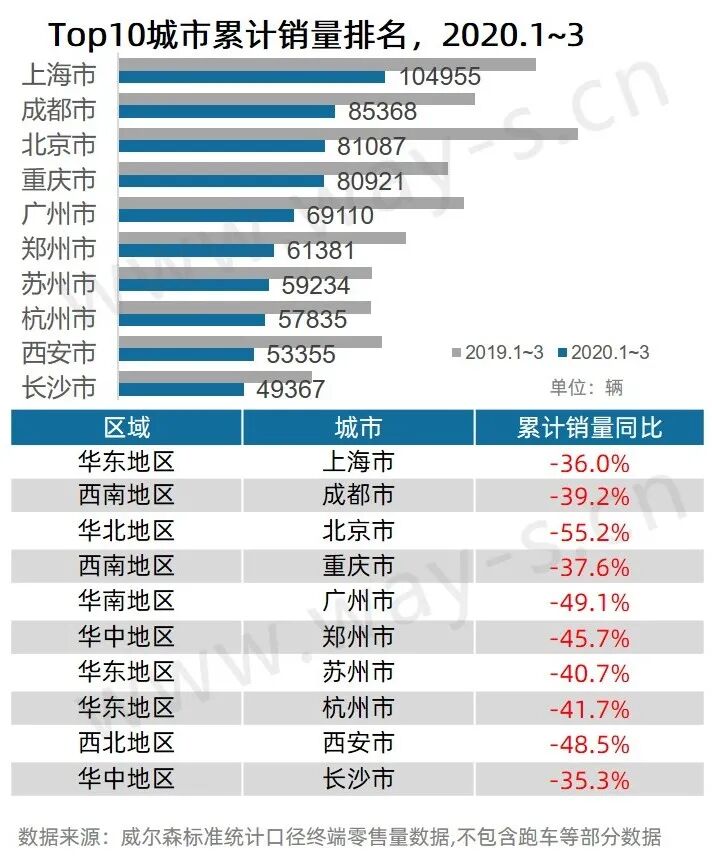 第一季度销量方面,排名前十的城市跌幅均超-35%,前三位分别是上海市、成都市与北京市。
