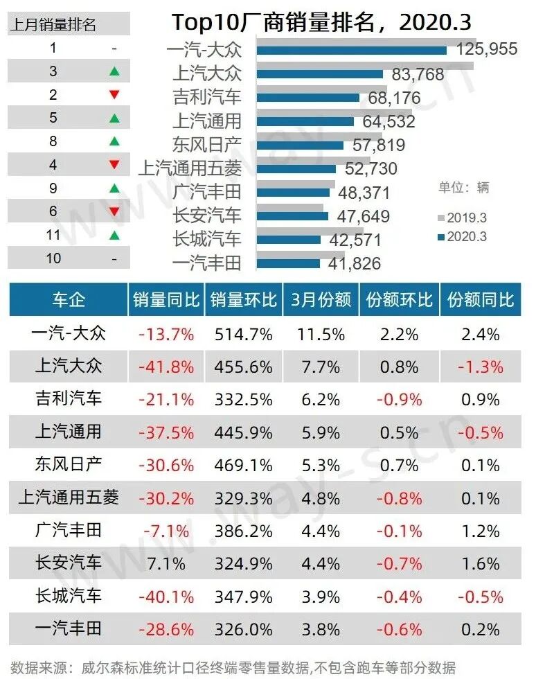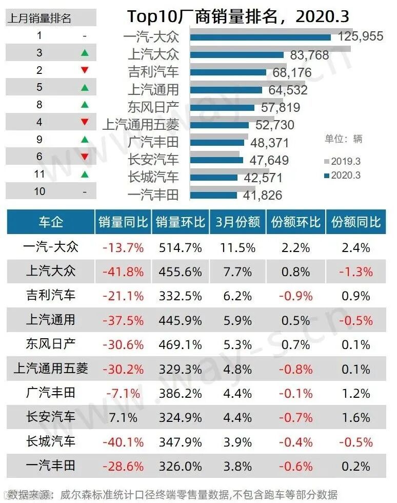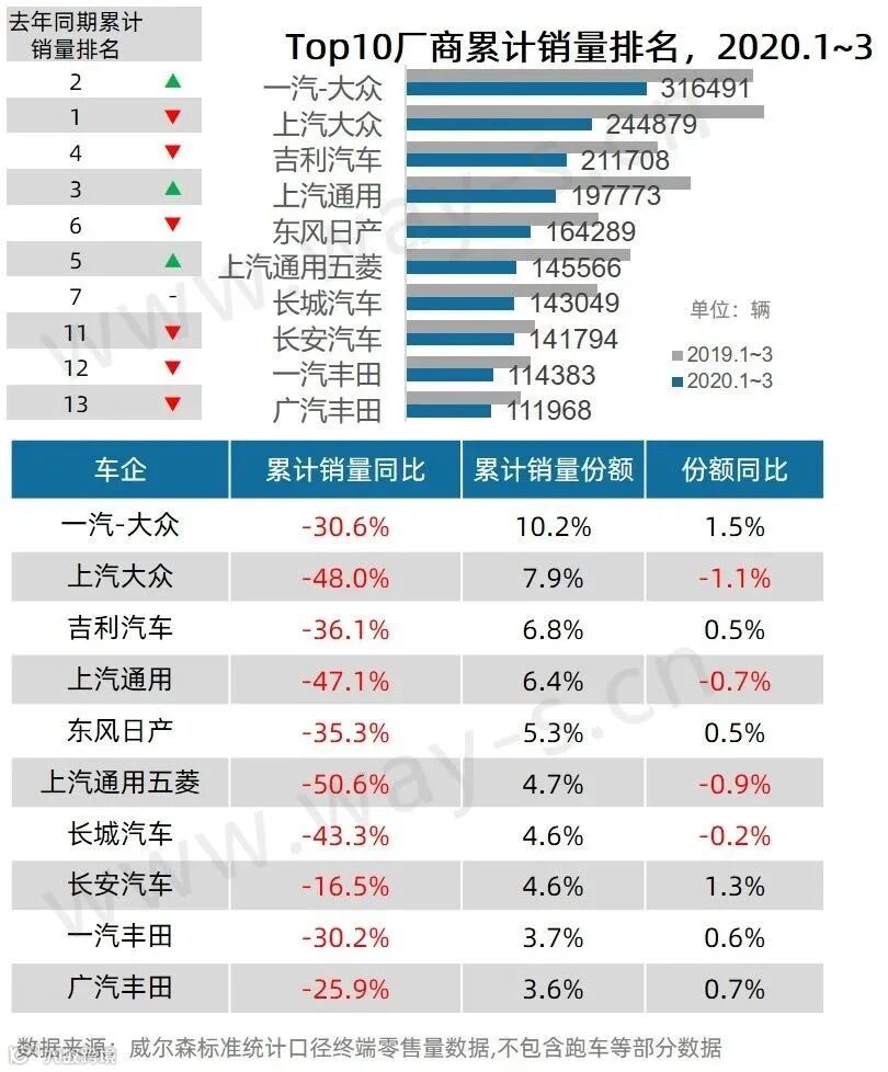 3月TOP10厂商榜单又形成新局面:一汽-大众销量基本回升至正常水平,以明显的体量优势领跑市场;近期迅速调整状态后的上汽大众重返亚军位置,但同比缺口仍超四成,还不能掉以轻心;自主品牌的领头羊吉利汽车排名第三;上汽通用虽无缘榜单前三位置,但排位有所上升,东风日产和广汽丰田销量同比跌势收窄,排名有所提升;长安汽车作为榜单中唯一同比正增长的车企,无疑是车市寒冬里的一抹亮色。