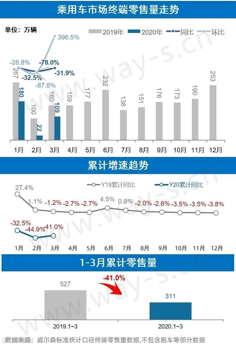 3月整体乘用车市场终端零售量为109万辆,同比下降31.9%,环比上升396.5%。2020年累计销量311万辆,累计同比下滑41.0%。