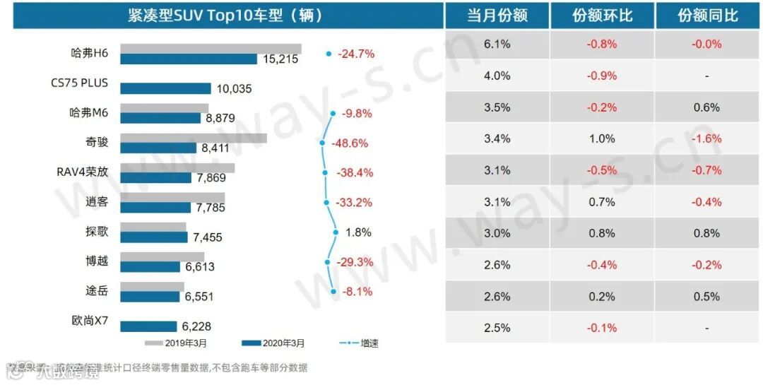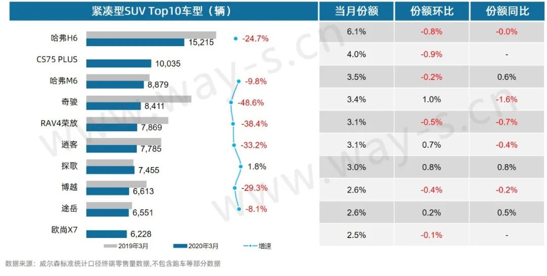 3月紧凑型SUV中,自主车型包揽榜单前三;哈弗H6稳居榜首位置,其兄弟车型哈弗M6同比跌幅已缩窄至个位数水平;探歌销量同比微增1.8%,时隔两月重回畅销榜单;欧尚X7虽上市不久,但连续两月上榜,表现不俗。