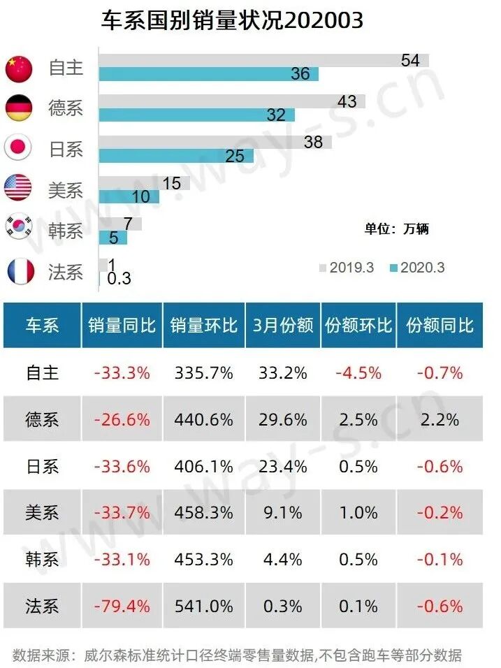 3月各系别环比均有大幅回升,但同比方面,除德系跌幅能控制在-30%以内,其他系别跌幅均超三成,缺口仍较大,德系品牌的市场份额进一步扩大,抢占其他系别的市场。