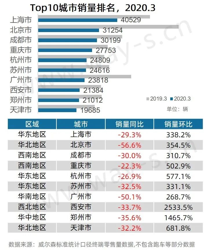 3月TOP10城市中各城市同比均大幅下降,虽上海市已持续多月保持在销量榜首位,但同比跌幅也接近-30%;排在第二的北京市,跌幅更超-50%;重庆市表现相对略好,是前十城市里同比降幅在-25%以内的城市。