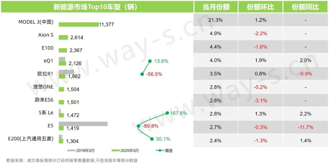 新能源市场中,国产MODEL 3表现强势,虽上市仅三月加上疫情影响,但销量仍迅速破万辆;eQ1销量同比增长13.6%跻身榜单前十;E200销量同比大增30.1%,销量表现亮眼。