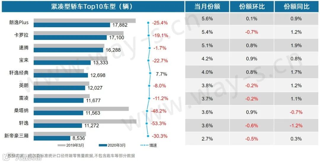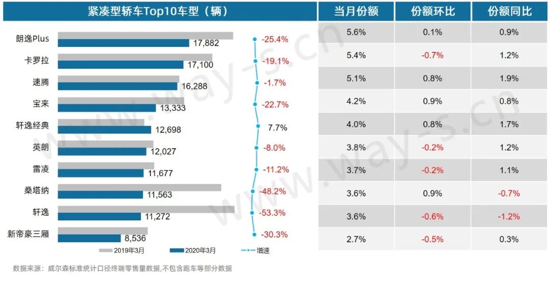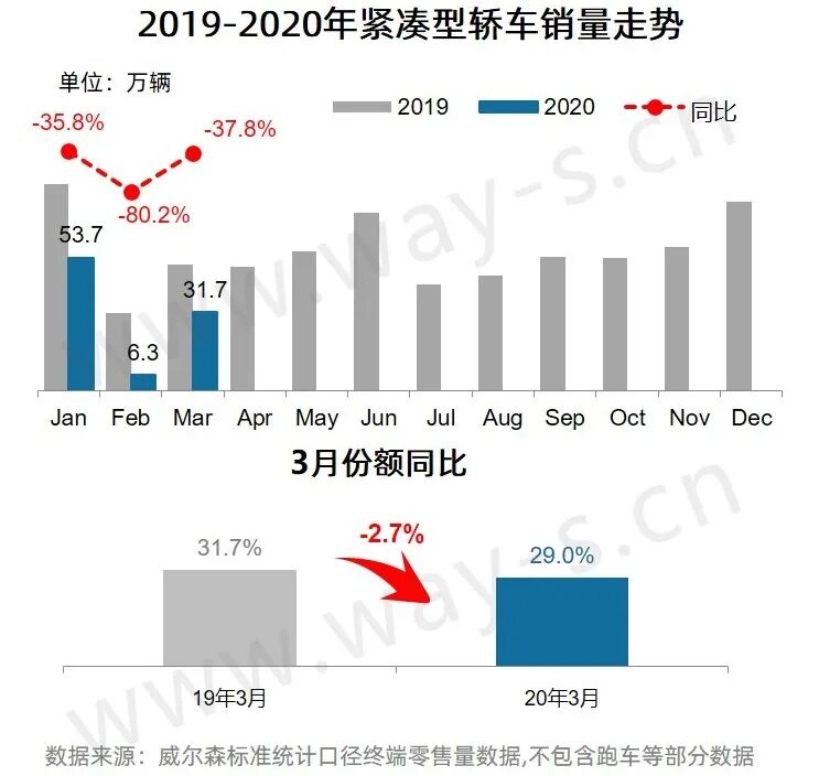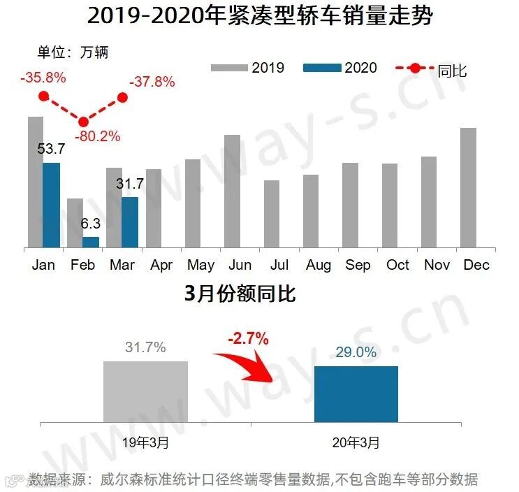 3月紧凑型轿车销量为31.7万辆,同比下降37.8%;份额为29.0%,同比下降2.7%。
