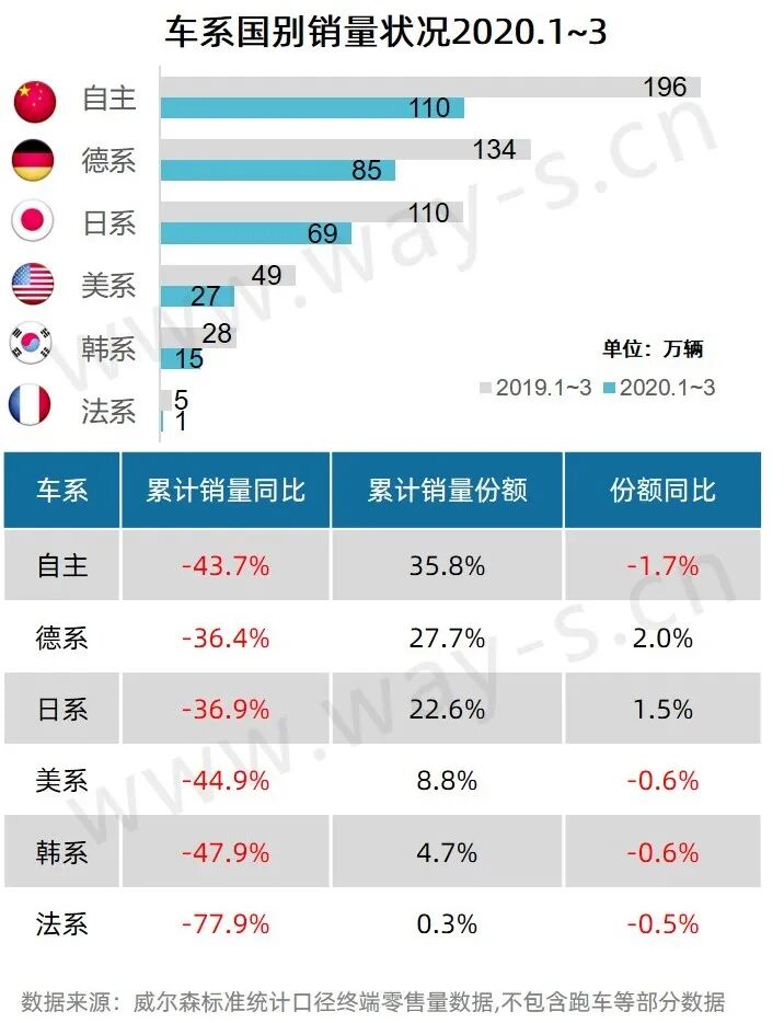 从第一季度销量来看,德系与日系的抗跌能力相对较强,第一季度的跌幅均小于大市跌幅,市占比也有所增长。