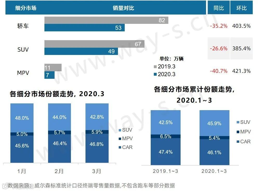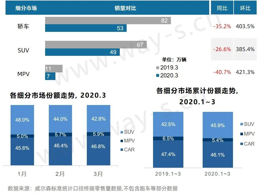 从第一季度累计销量来看,SUV市场跌幅为-36.9%,是三大市场里面跌幅最小的,SUV的市场份额虽仍不及轿车市场,但市占比较去年同期上升了约3.3%,而MPV市场仍未摆脱颓势,同比跌幅超-50%,市场份额进一步萎缩。