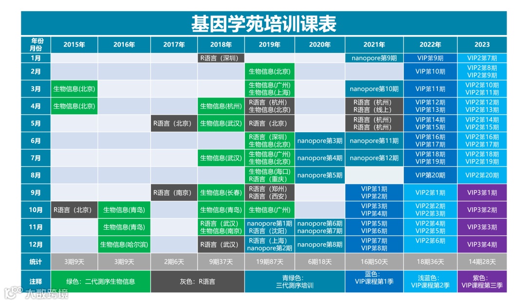从2015年我们就开始生物信息培训,现在已经是第9个年头。在2021年我们推出了基因学苑VIP计划第一季,目前已经有超过500人学习了第一季的课程。第二季于2022年9月-2023年8月举办,有超过120人参与直播学习。