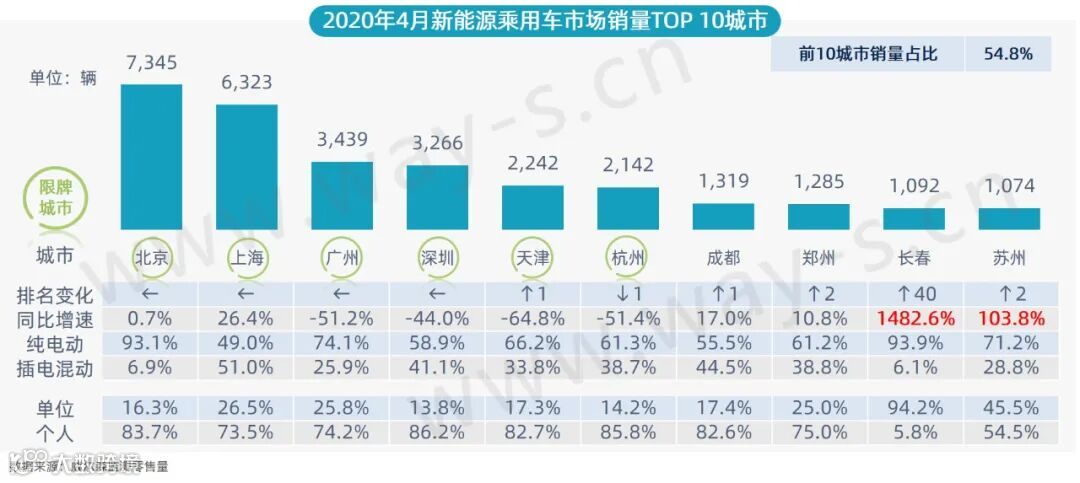 4月,前10城市销量占比为54.8%;限牌城市销量排名靠前,北上广深稳居前四;长春在单位用户的带动下,销量同比大增,排名上升40位,位居第九;苏州增幅较大,位居第十。