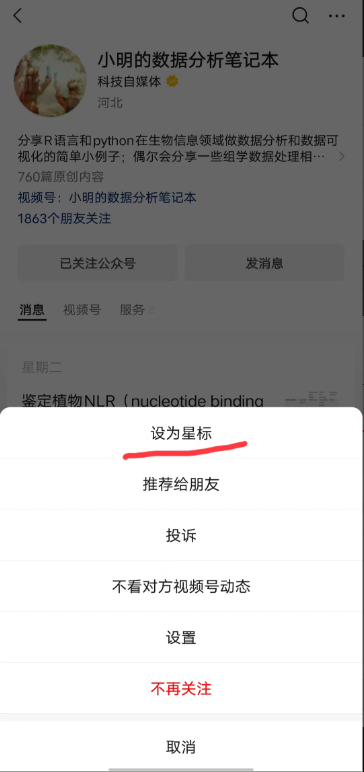 微信公众号好像又有改动,如果没有将这个公众号设为星标的话,会经常错过公众号的推文,个人建议将 小明的数据分析笔记本 公众号添加星标,添加方法是