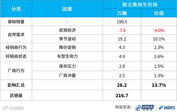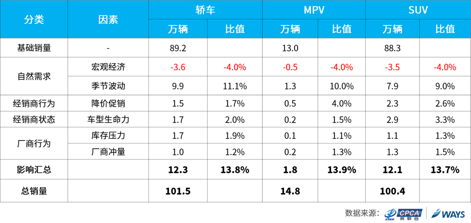用量化方法将影响批发量的主要因素拆解后可知,影响2019年12月狭义乘用车市场批发量的主要因素包括:季节性上升、车型生命周期指数上升及终端促销降价带来的增量;此外,宏观经济下压,消费信心不足,导致一定的减量。