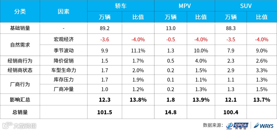其次,相比2019年10月,MPV市场12月在基础销量上增量13.9%。季节性上升,带来10.0%的增量;经销为进一步刺激购车,促销降价带来4.0%的增量;厂商加快批发节奏,带来1.3%的增量。此外,宏观经济下压,汽车市场消费不景气,造成4.0%的减量。