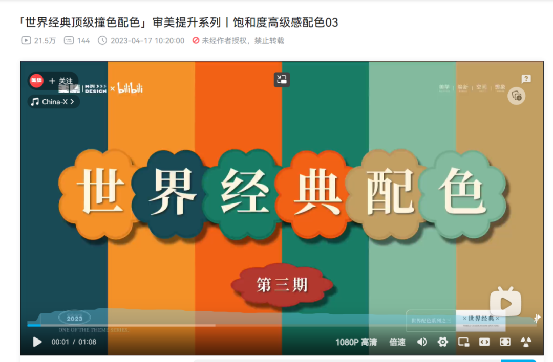然后找到这个up主的主页来看了下,其中有四个视频是国潮顶级配色,还有一个视频是世界经典配色,个人觉得还挺好看的,保存下来作为R语言科研数据可视化中的配色备选方案,这里只保存视频封面的配色,视频里还提供了很多两两搭配的配色,这个有点多,有时间了再抽空整理