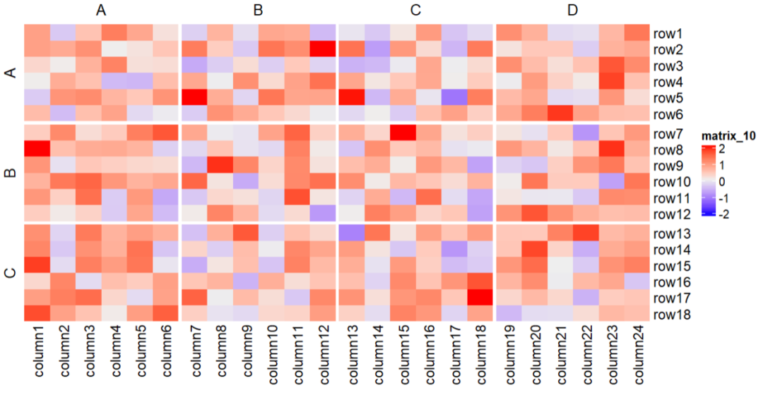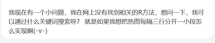 热图每隔三行分开一小段 怎么实现?我最开始的想法是用ggplot2来做,将数据拆分,每三行数据做一个图,最后采取拼图的方式来实现。