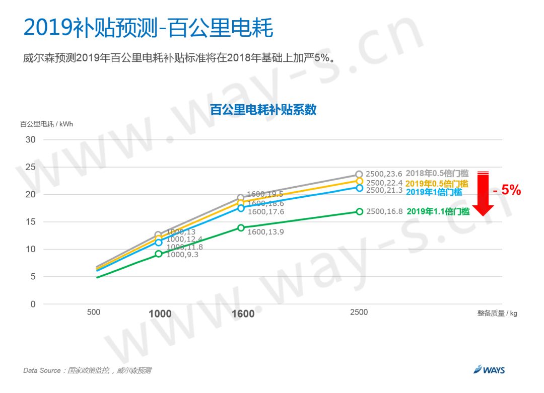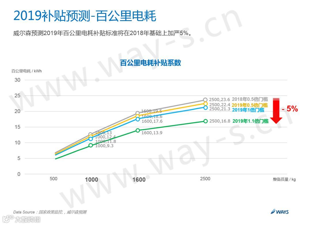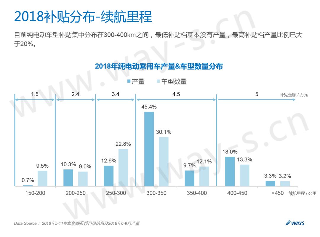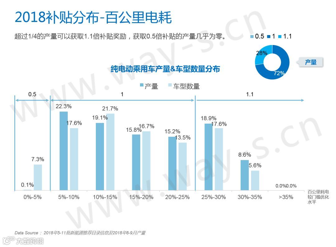 75%的产量获取1倍补贴,25%的产量获取1.1倍补贴。2019年还会继续加严,问题就在于是加严5%还是10%。可以看到途中5%-10%这个区间目前有22.3%的产量,这部分主要都是A00级别的小车,做过研发的朋友会深有体会,由于百公里电耗的计算公式和整备质量相关,A00级别的小车质量都很轻,所以想要提升百公里电耗非常困难。所以如果整体加严10%的话,很多A00小车会无法获取补贴,这对于A00市场的打击是毁灭性的,而A00又是整体纯电动市场的销量支柱,因此预测未来只会整体加严5%。