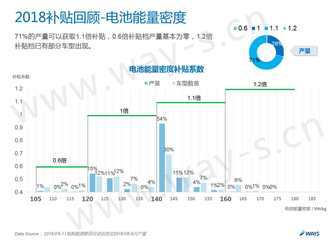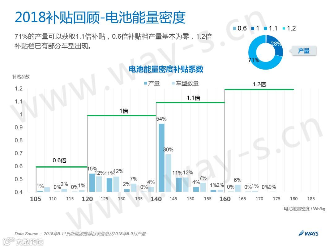 目前电池能量密度分了4个档,大多车型都可以获取1.1倍的补贴。