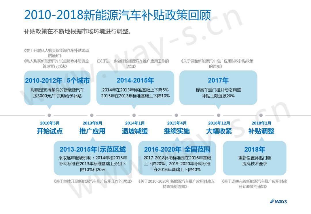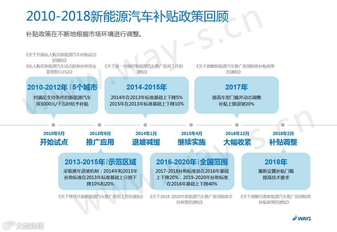 补贴政策在2010年正式推出,当时找了5个城市做试点,按照3000元/千瓦时来补贴,所以从最一开始大家就要清楚,新能源汽车这五个字中,最重要的是“能源”二字,能源转型才是真正的目的所在。