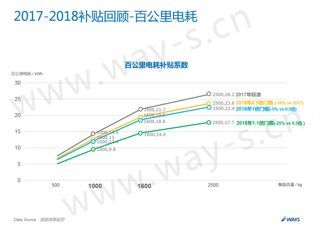 前几年的政策推行并不理想,国家在2013年曾第一次提出了补贴退坡机制,不过在2014年很快就对退坡的幅度进行了调整,大多是因为发展没能达到预期的缘故。2015年是个重要的节点,当年公布了2016-2020年的补贴政策,并且明确了退坡幅度:2017-2018退坡20%,2019-2020退坡40%(相较于2016);2017年的政策如规执行,退坡20%,但大量骗补企业的涌入也让国家明白了,简单粗暴的补贴对新能源行业并无裨益,随即引入了百公里电耗和电池能量密度的概念,并在2018年最新的政策中对这两个技术参数进行了进一步加深。