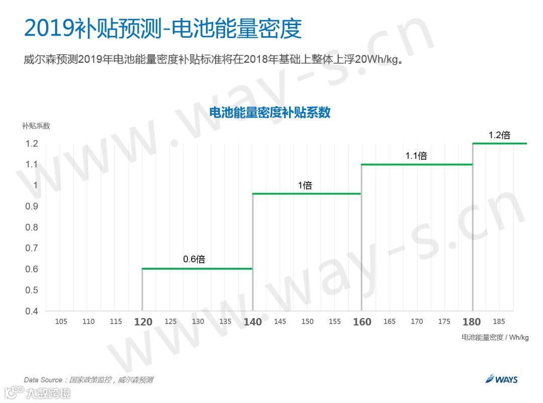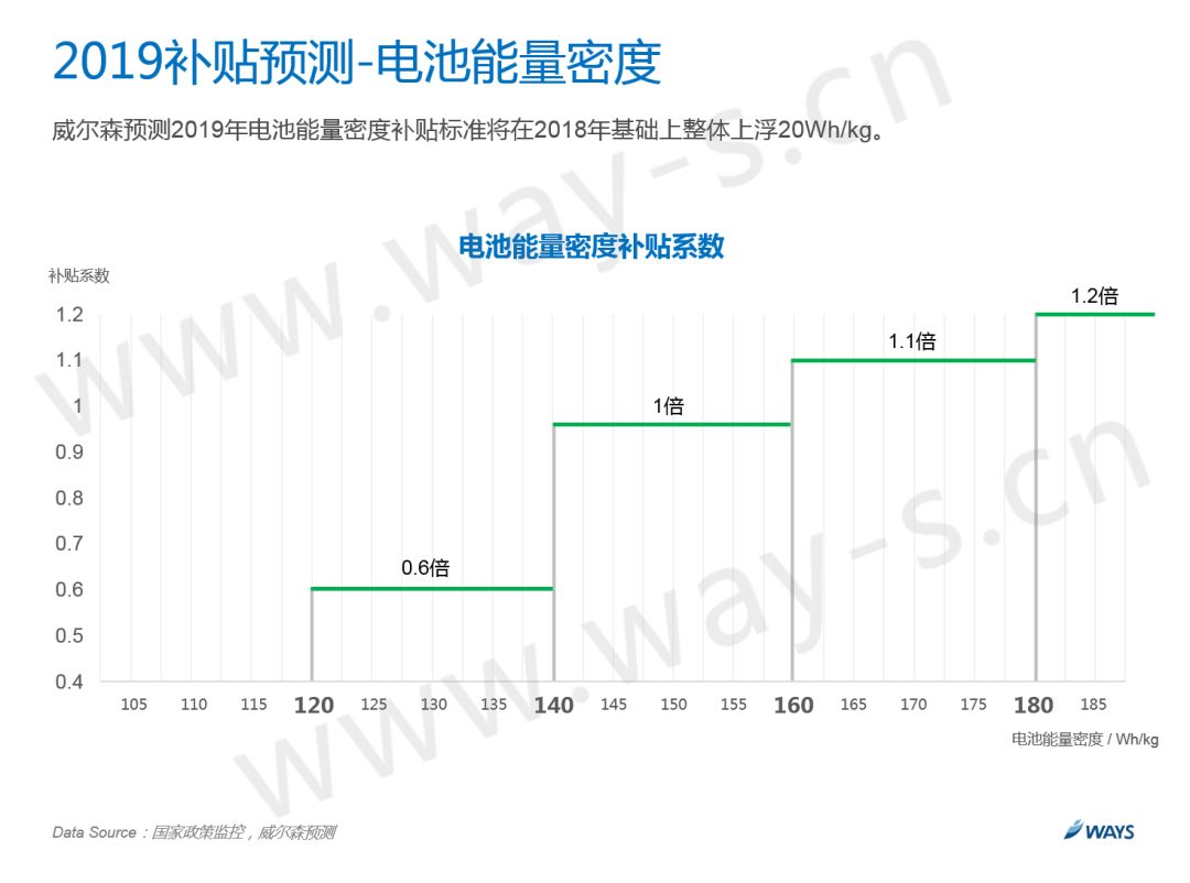 然而国家明确提出了2020年300wh/kg的指针,所以在政策的倒逼下,能量密度的标准还是会进一步提升。根据一些电池厂家的规划,预测明年整体上浮20wh/kg。