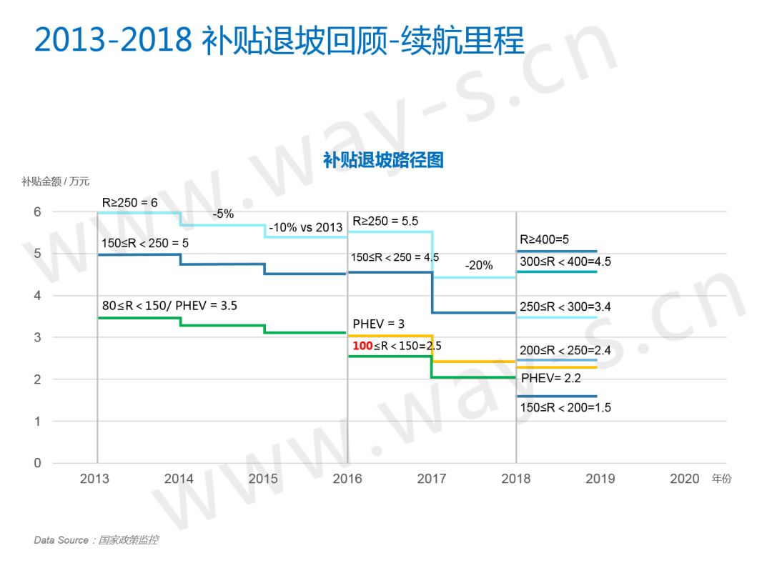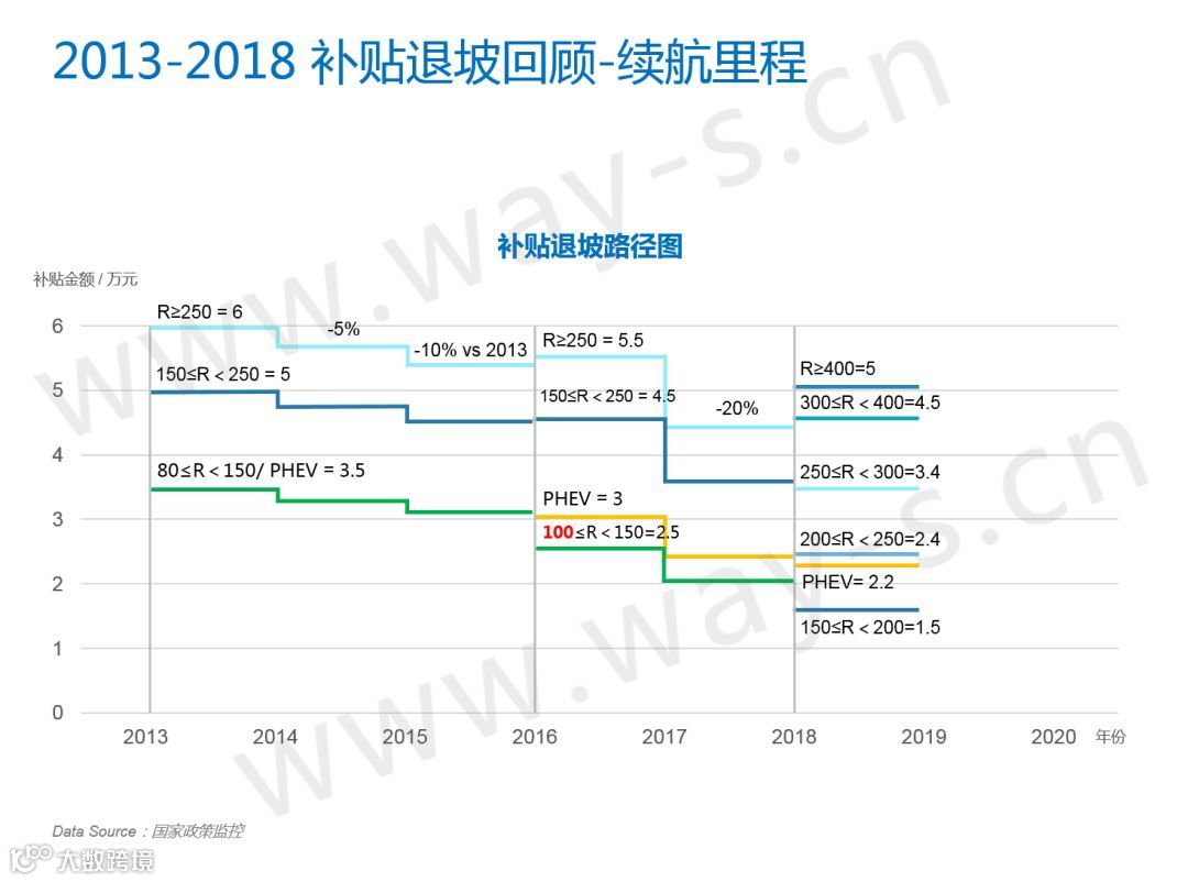 从2013年续航里程退坡开始,总体趋势上可以分为三个阶段。第一个阶段是13年到15年,按照续航分了三个档,每年退坡5%;第二个阶段是16年到17年,还是按照三个档,退坡20%;理论上按照之前公布的政策,2017-2018的补贴应该保持一致,不过为了体现“扶优扶强”的策略,国家做了较大幅度的调整,补贴按续航划分为了五个档。