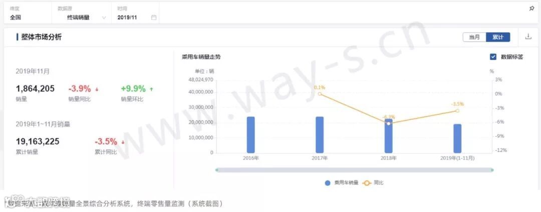 2019年前11月中国汽车市场仍在延续2018年的低迷态势,虽有各种利好政策相继出台,但市场依旧没有太大起色,上半年持续多月负增长状态,直到6月在“国六切换”以及新能源补贴退坡等因素的强力拉动下,低迷多时的终端市场才终于暂时恢复正增长。下半年“金九银十”以及年末购车旺季带动销售,市场略微有所回温,截至11月底,整体乘用车市场终端零售量累计销量1916万辆,仍较去年前11月累计同比下滑3.5%。