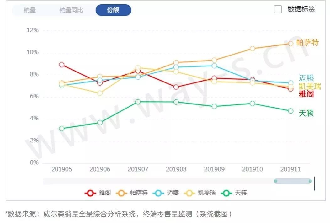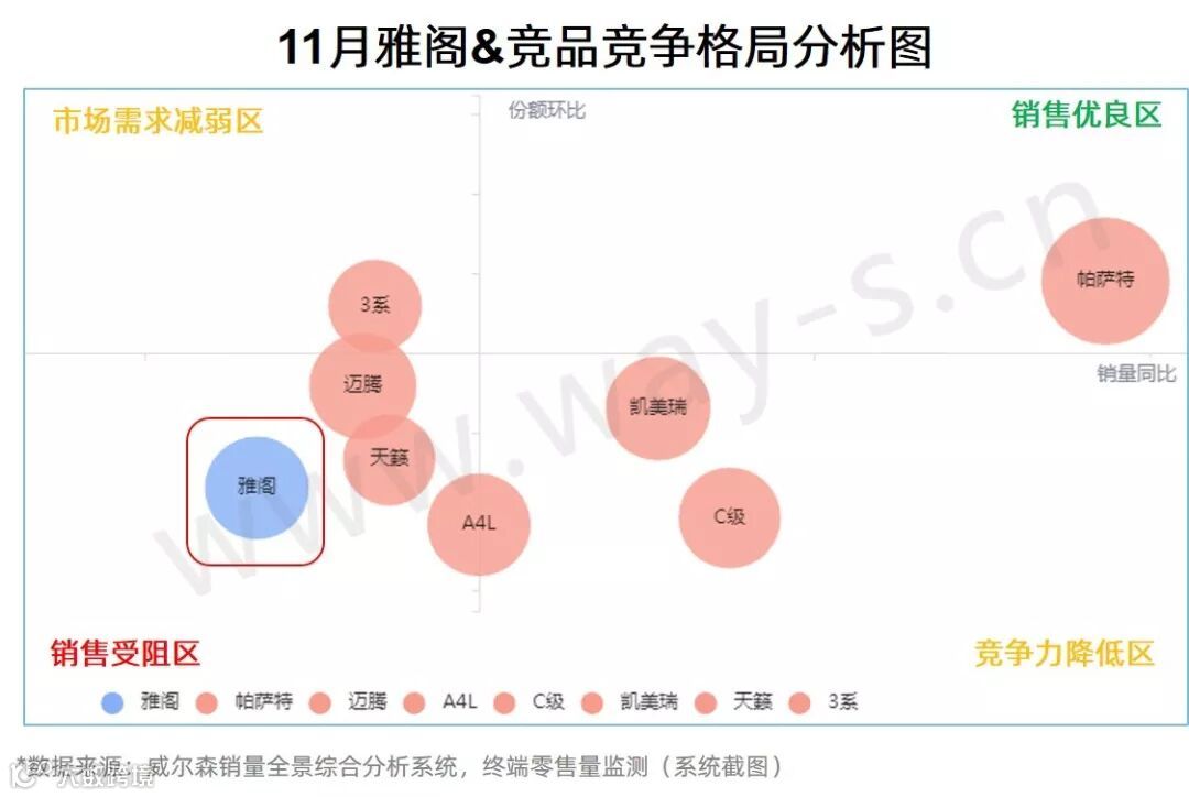 雅阁方面,10-11月的降幅均超20%,从竞争格局图可以看出,目前雅阁处于销售受阻区,主要受到了同级别车型的挤压,尤其是与日系同样强劲的德系竞品,帕萨特最近势头凌厉,销量明显提升,直接碾压其他同级车型,实力不容小觑。
