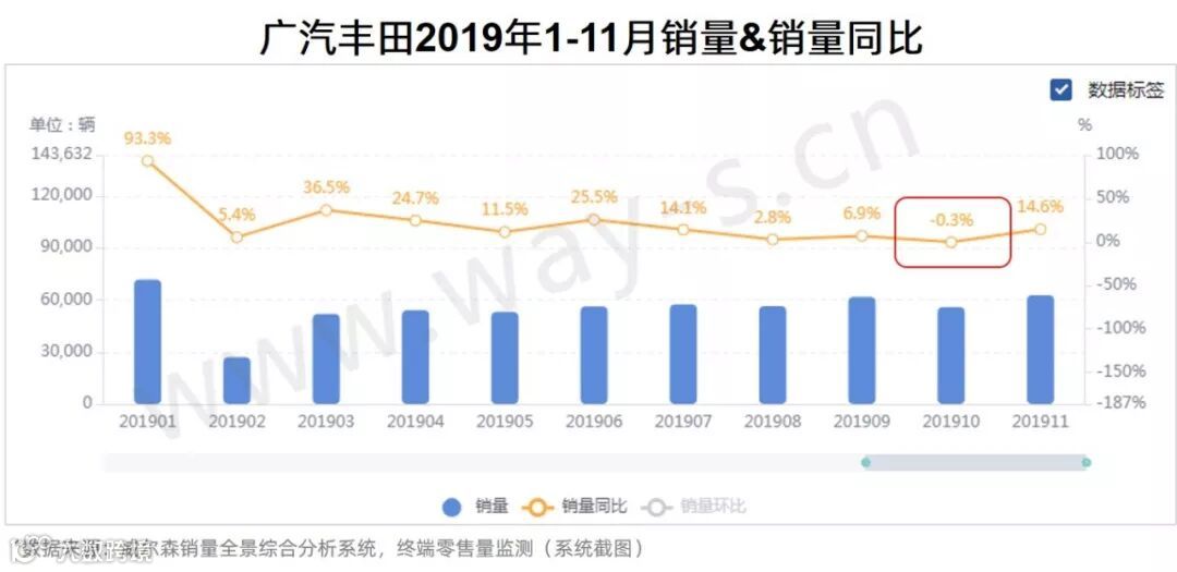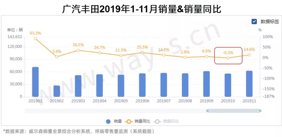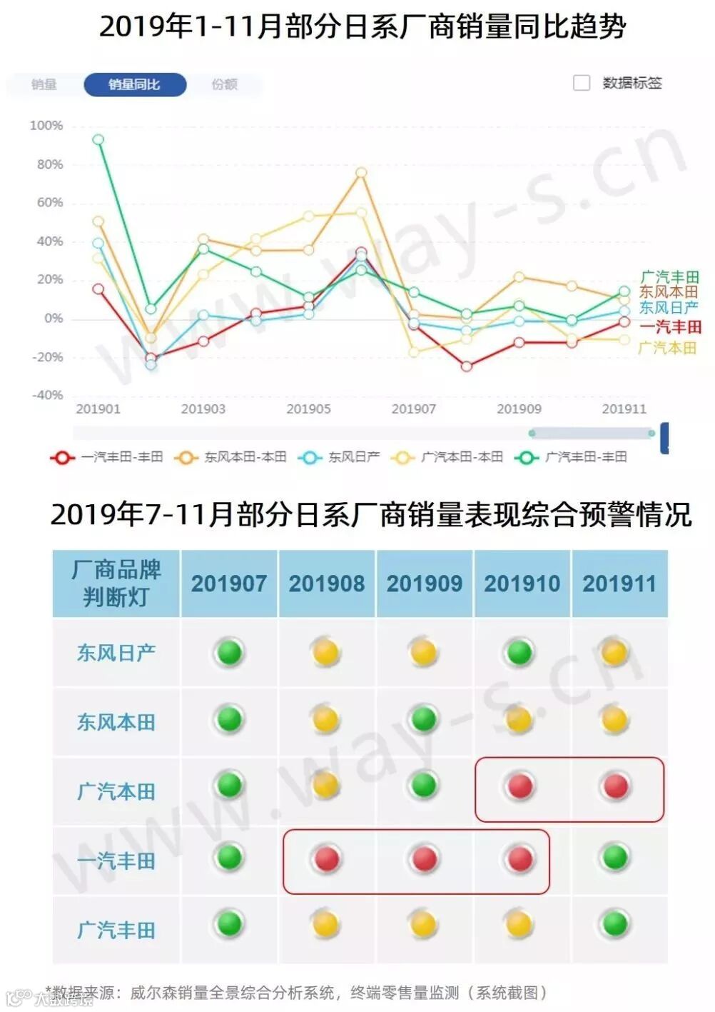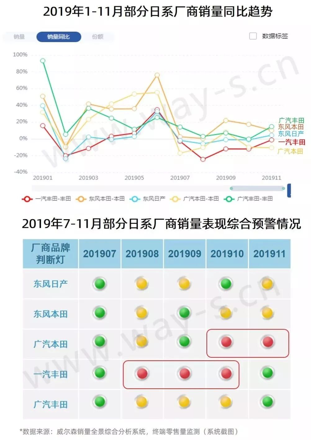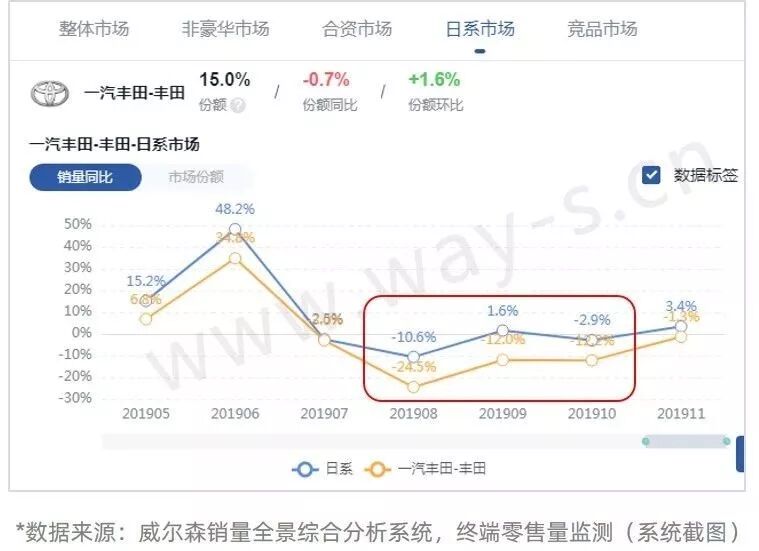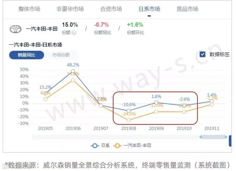 一汽丰田累计销量达68万辆,位于广汽丰田之上,但累计销量同比下降1.9%。据威尔森销量全景综合分析系统,一汽丰田处于市场需求减弱区。据威尔森监测,今年开始一汽丰田单月销量同比增速一直低于日系整体增速,从8月开始,差距越发加大, 8-10月销量出现红灯警示。