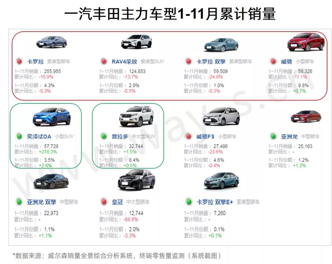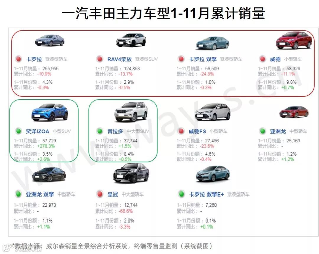 从车型表现来看,2019年1-11月,除去累计销量同比大幅增长的奕泽IZOA(其去年6月末才上市销售,同比基数较小)、处于销量及份额双增销售优良区的普拉多,一汽丰田旗下部分畅销车型表现均为红色预警状态,值得注意。