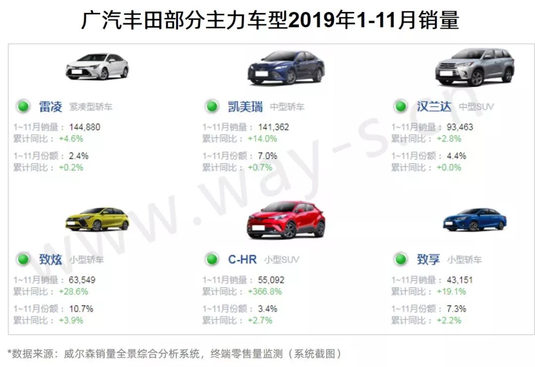 丰田另外一家厂商广汽丰田累计销量同比增长19.2%,较去年同期增长近两成,表现亮眼,累计销量则近61万辆。其上半年发力强劲,单月销量同比增速靠前,下半年表现相对保守,基本已能按计划完成销售目标,发力有所减弱,在10月两款主力车型致炫、致享改款上市期间,销量同比略有下滑,11月销量同比迅速恢复至正常水准。旗下销量前六的主力车型2019年都有不错的表现,推动品牌整体向上。
