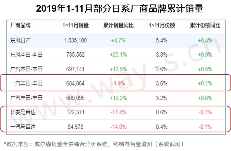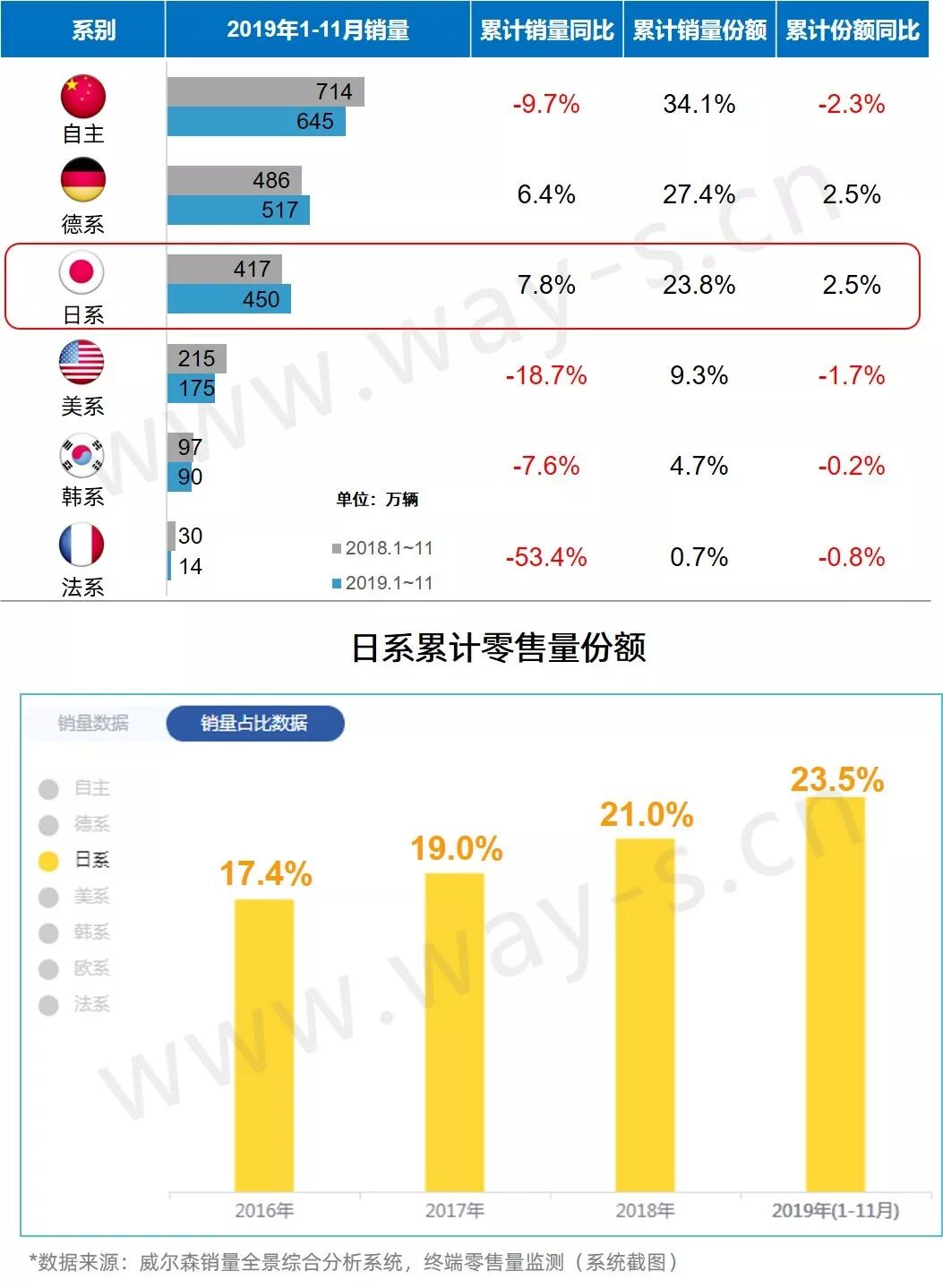 在此背景下,细看各系别的表现,2019年1-11月,仅有德系和日系保持销量同比正增长,市场份额也在同步扩大;自主品牌虽仍占据市场主导地位,但销量对比去年同期缺口仍近10%;美系销量同比跌幅近两成,而法系销量同比腰斩。值得注意的是,日系累计同比增长7.8%,暂时在市场上保持领先优势,并且在近4年里销量稳步上升,市占比从2016年的17.4%上升至2019年前11月的23.5%,发展迅猛。