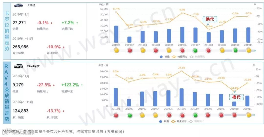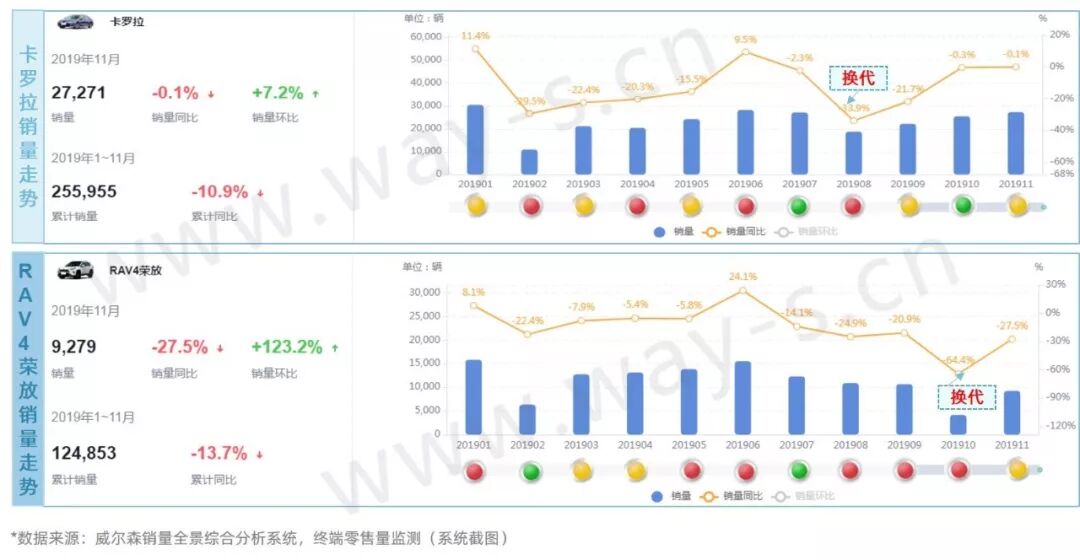 另一主力车型RAV4荣放与卡罗拉情况相似,但其10月末才换代上市,错过了“金九银十”,10月换代当月同比降幅达64.4%,11月同比降幅才有所收窄。