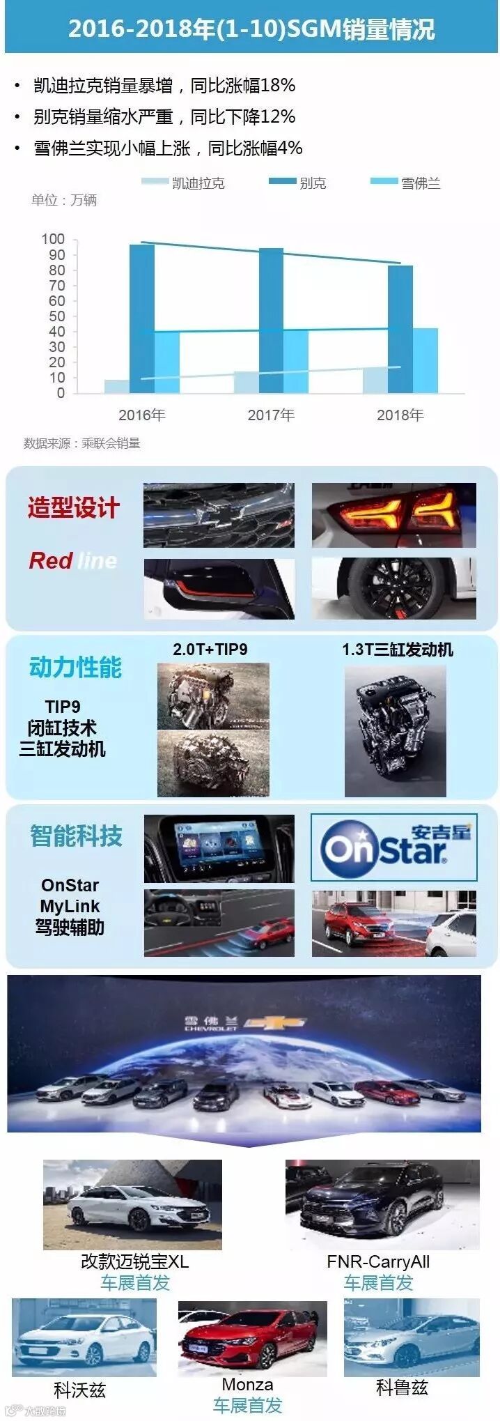 受车市大环境及诸多因素影响,上汽通用传统主力品牌别克销量下滑趋势明显,相比之下性价比更高的雪佛兰品牌将设计、性能、科技感作为核心竞争力,重新受到消费者追捧,未来大有可期。