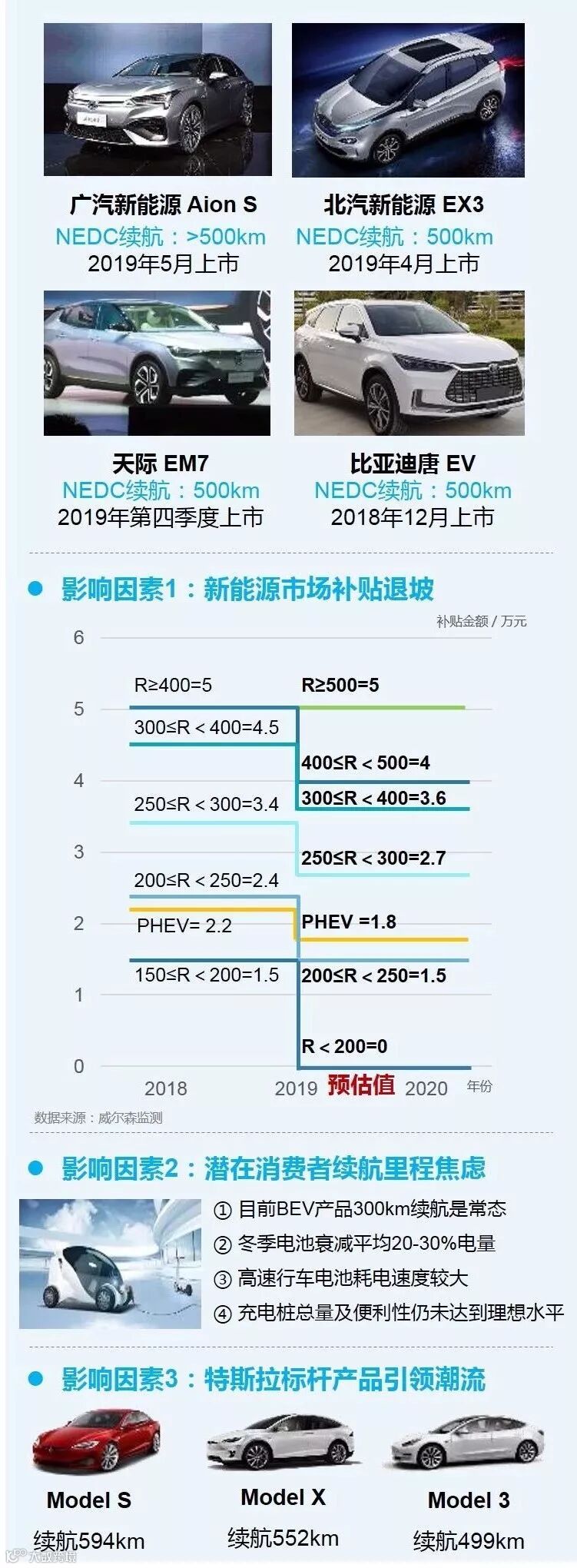 随着各方面技术的进步,少数自主车企把新车续航提升到500km以上,进一步缓解里程焦虑的同时,还将获得更大的补贴空间,如比亚迪、北汽和广汽等企业的技术储备不容小觑。