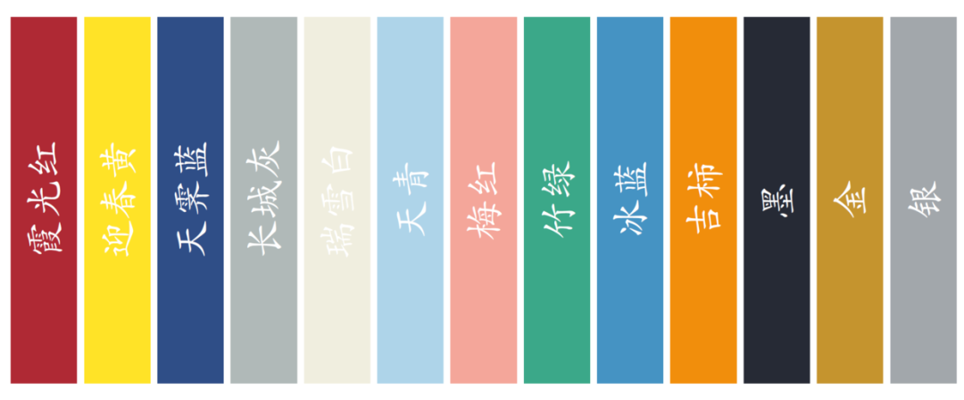 chineseCols<-c("霞光红","迎春黄","天霁蓝","长城灰",