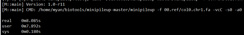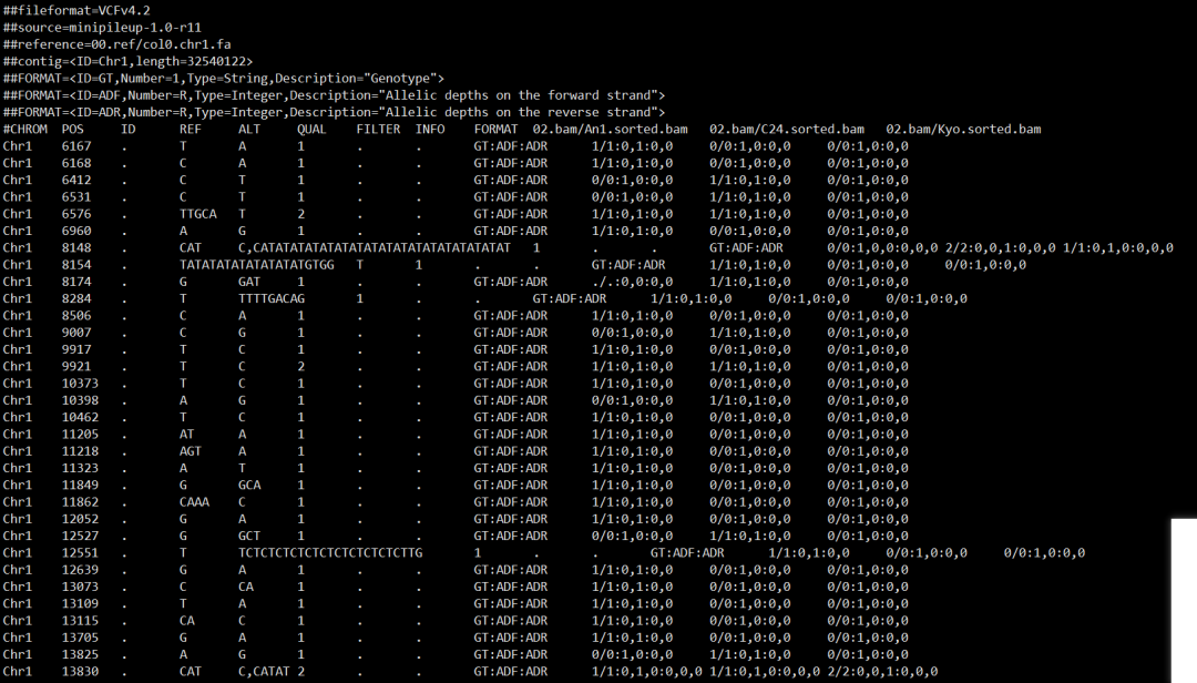 time ~/biotools/minipileup-master/minipileup -f 00.ref/col0.chr1.fa -vcC -s0 -a0 -q0 -l 20000 02.bam/An1.sorted.bam 02.bam/C24.sorted.bam 02.bam/Kyo.sorted.bam > var.vcf