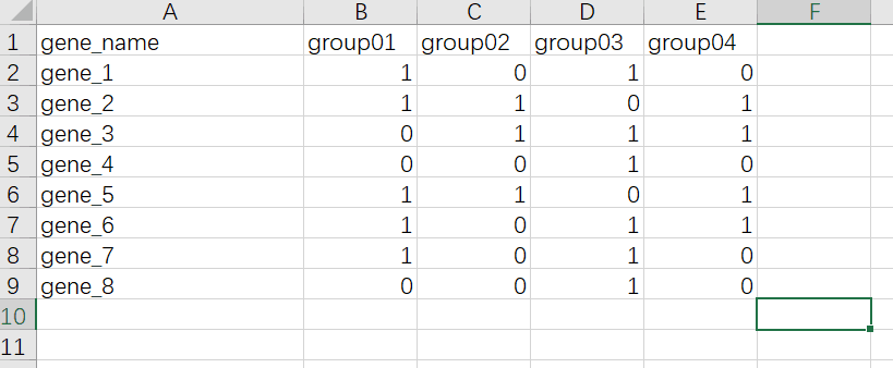 后面每一列是数据分组,如果这个基因存在于这一组,就标识为1,如果不存在就标识为0