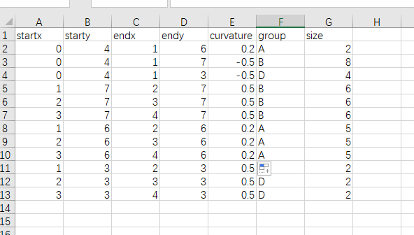 curvature=0 这个参数设置为0 就是直线,改成其他数值就是带有弧度的线,正负值可以改变弧度的方向,但是遇到一个问题是 入果用geom_curve()这个函数的话 curvature 是不能放到aes()里的,在网上搜了搜,也有人讨论到这个问题
