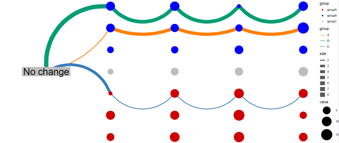 Figure4a 的主体是一个气泡图,然后用曲线线段连接点,曲线线段可以用 geom_curve()函数来实现