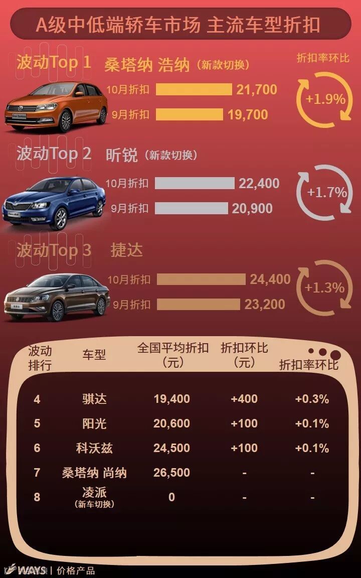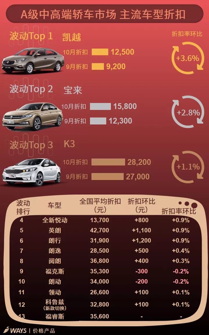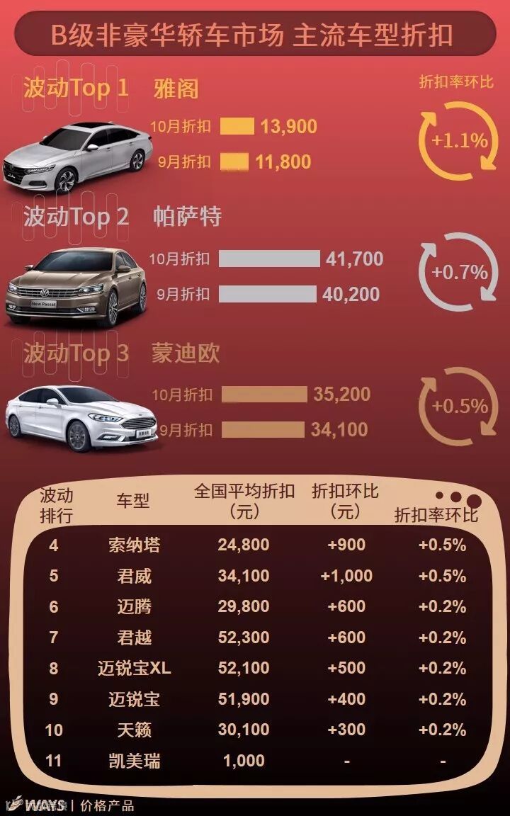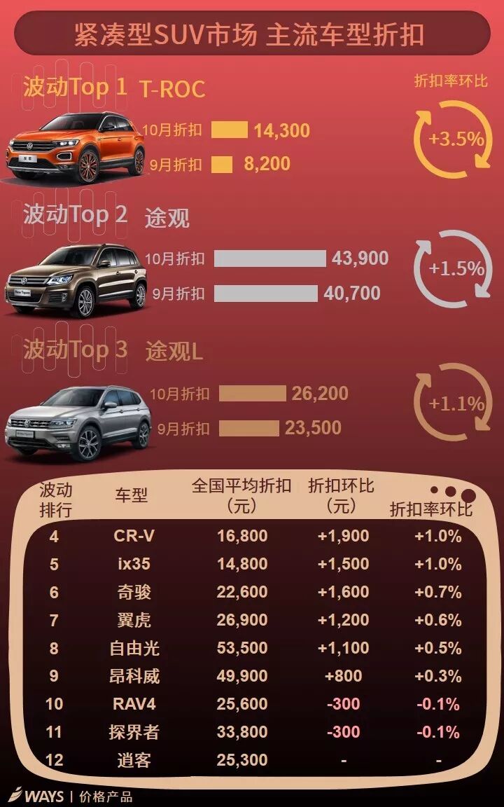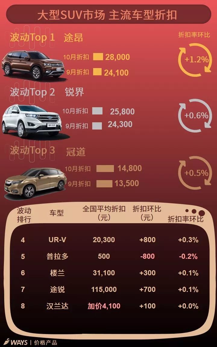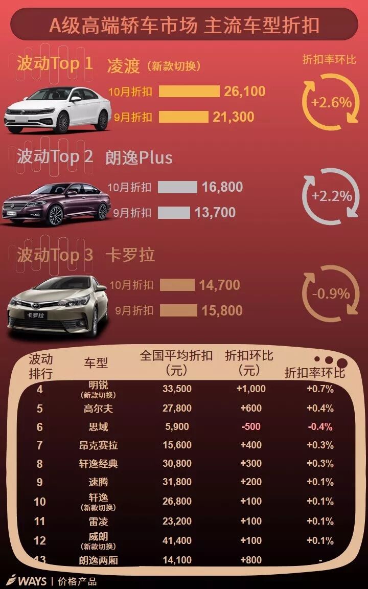 非豪华车市场方面,大众品牌部分车型10月价格下降较多,改款凌渡价格降幅达2.6%,折扣增加4,800元;新车朗逸Plus价格降幅为2.2%,折扣增加3,100元;新车探歌价格降幅为3.5%,折扣增加6,100元;途观与途观L也增加了3,000元左右的优惠。