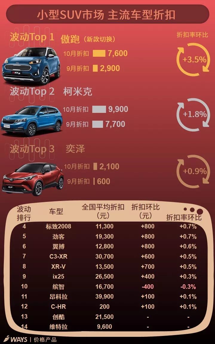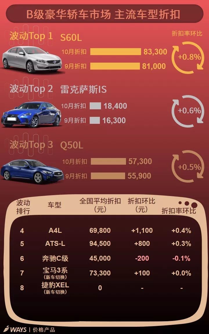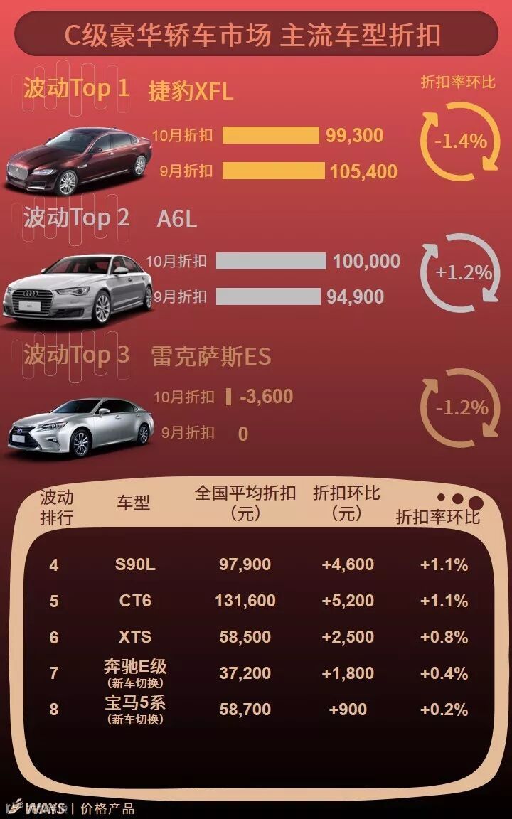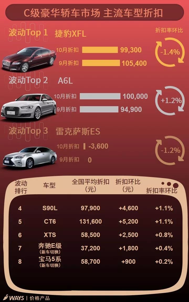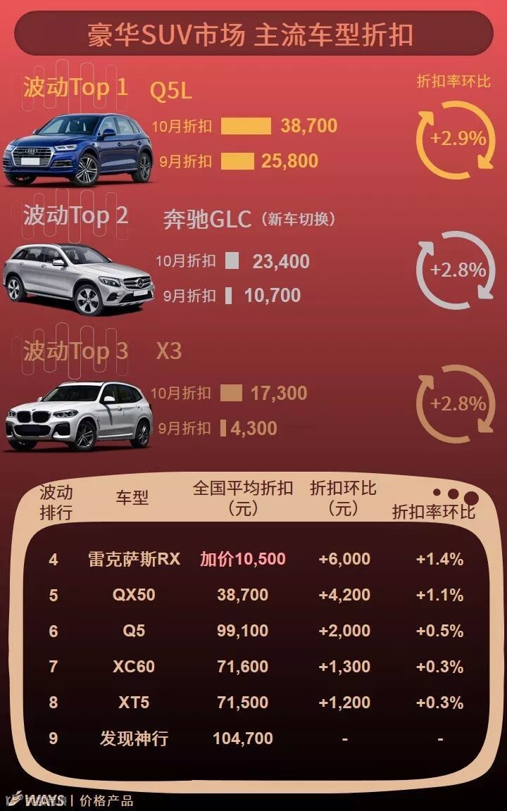 豪华车市场方面,奥迪A6L继续释放优惠,10月折扣共增加5,100元,终端优惠已突破十万元;Q5停产,Q5L资源增多,10月折扣增加近13,000万元,价格降幅达2.9%。2019款奔驰GLC和宝马X3 10月也有近13,000元的优惠。捷豹品牌受资源减少影响,XFL继续回收优惠,10月累计回收优惠6,100元,2019款XEL上市后稳定0折扣。