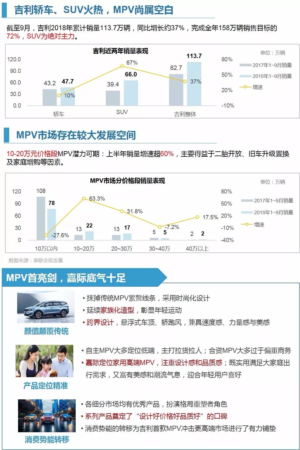 吉利推出首款MPV,意在填补产品谱系空白,开启“三驾马车”均衡发展新格局 ;嘉际抓住了家用高端MPV发展大潮,将精力集中于设计感、品质感的营造,精准定位追求多元化用车体验及注重品质的新一代消费者,其或将成为MPV市场领军者。