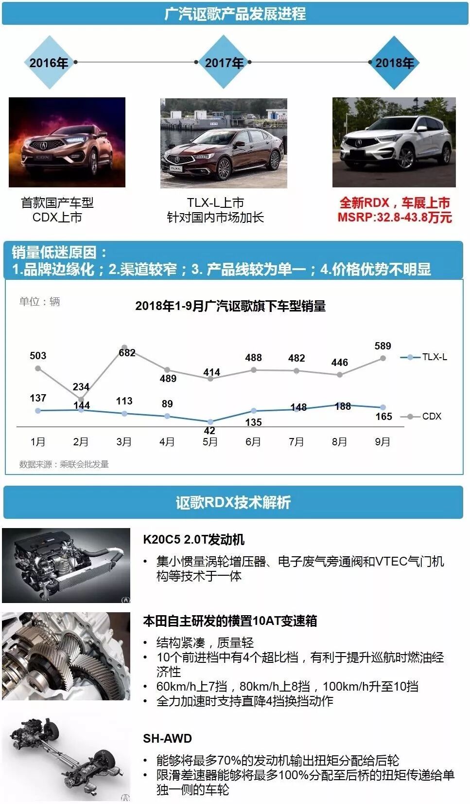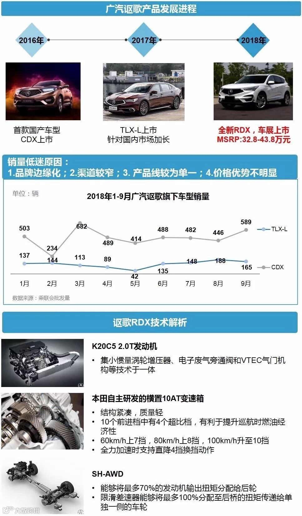 讴歌2016年实现国产,2017年在这一利好条件下销量大增;但自2018年以来,品牌销量持续下滑,1-9月整体销量不足6千台,本次车展,品牌带来了第三款国产车型RDX,该车主打技术路线,肩负挽救销量的重任。
