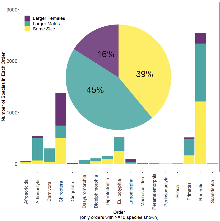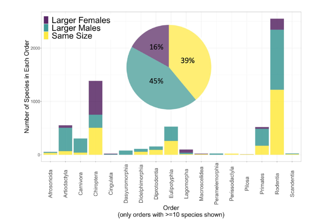 这个论文的研究内容很有意思,论文的题目是说 新的估计数据显示,在大多数哺乳动物物种中,雄性并不比雌性体型更大。 在我之前的认知里一直是大部分的哺乳动物的雌性体型是大于雄性体型的。看到这个题目第一想法是为啥这个问题还需要研究。